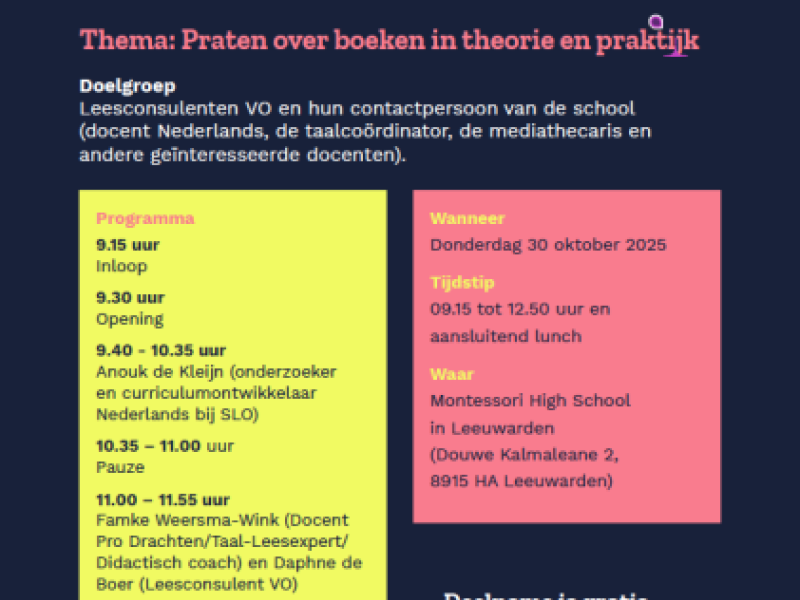 Thema: Praten over boeken in theorie en praktijk Doelgroep: Leesconsulenten VO en hun contactpersoon van de school (docent Nederlands, de taalcoördinator, de mediathecaris en andere geïnteresseerde docenten).